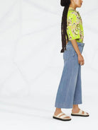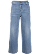 Indaco, effetto vissuto, dettaglio fibbia con logo, taglio crop, design classico a cinque tasche e passanti.
