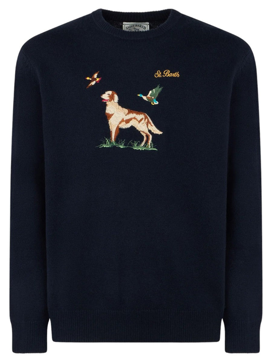 Sfoggia un look elegante e raffinato con la nostra maglia da uomo girocollo in tonalità blu donegal. Questo capo distintivo presenta una stampa piazzata jacquard raffigurante un puntatore inglese, simbolo di classe e tradizione. I dettagliati ricami del country club St. Barth aggiungono un ulteriore tocco di sofisticatezza. Con un fondo collo e polsini a costine, la maglia offre una vestibilità regolare e fedele alle dimensioni. Il logo St. Barth sulla manica sottolinea l'attenzione ai dettagli. Grazie alla composizione che combina cashmere, lana, viscosa e poliammidica, il comfort e la durata sono garantiti.